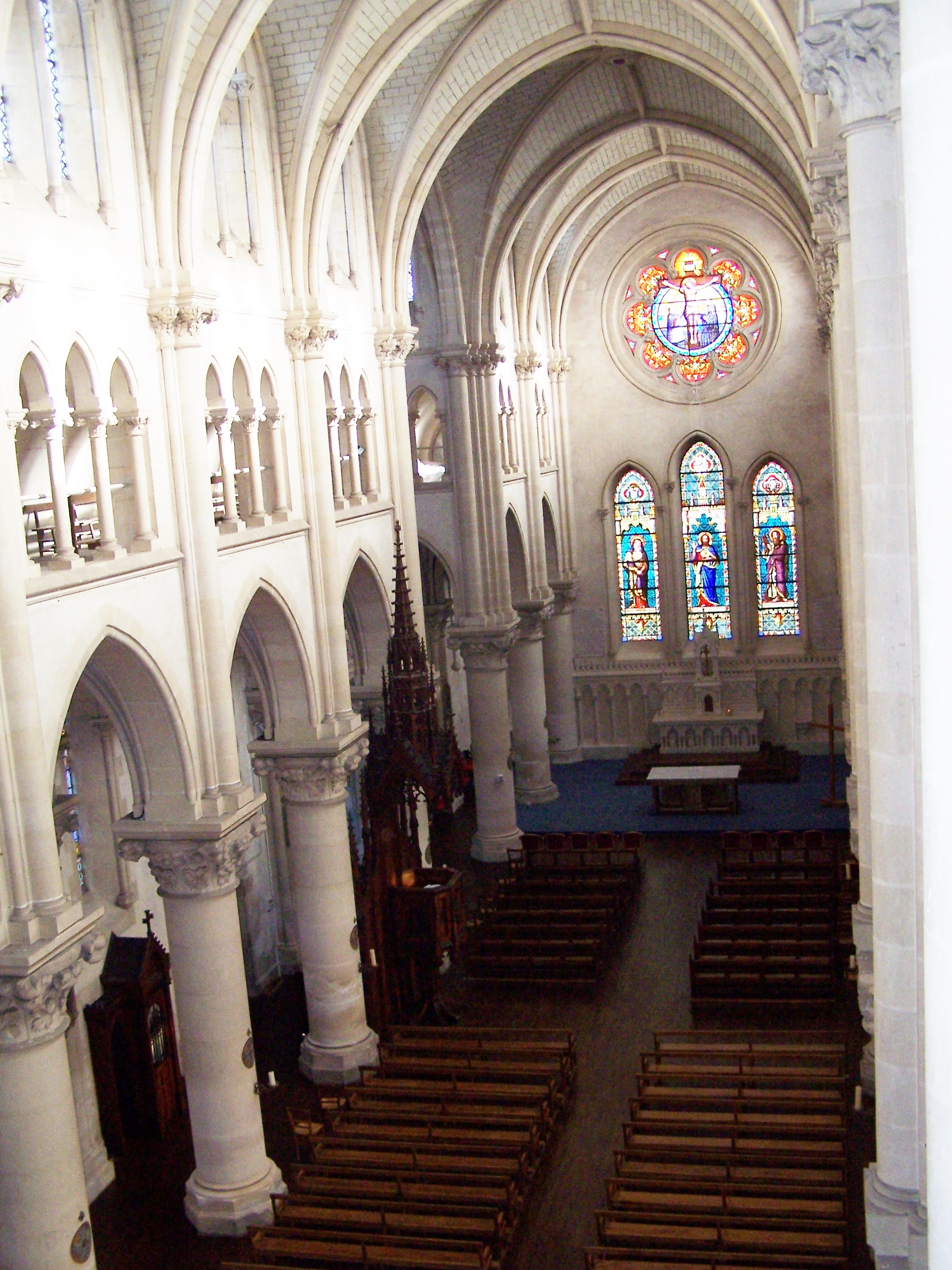 En y entrant, on est frappé par la hauteur des voûtes et le jeu de la lumière sur la pierre et les vitraux.